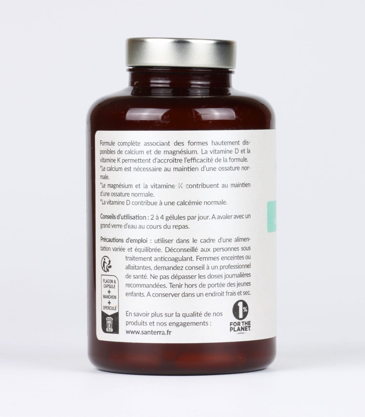 Ingrédients : Bisglycinate de calcium, pidolate de calcium, tunique : gélifiant hydroxypropylméthylcellulose, bisglycinate de magnésium, ménaquinone-7 (vitamine K2-MK7), antiagglomérant : acide stéarique, cholécalciférol végétal (vitamine D3).