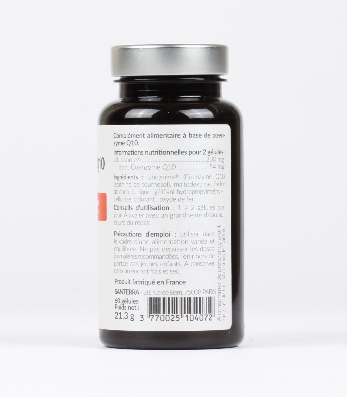 Ingrédients : Ubiqsome® (Coenzyme Q10, lécithine de tournesol), maltodextrine, farine de coco, tunique : gélifiant hydroxypropylméthylcellulose, colorant : oxyde de fer.