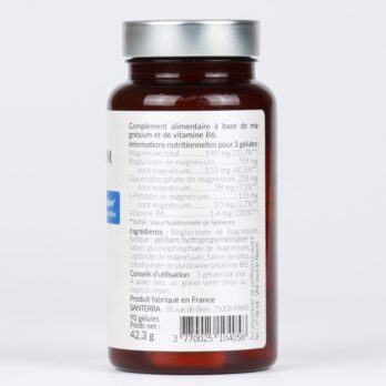 Magnésium B6 associe trois formes hautement biodisponibles et complémentaires de magnésium (bisglycinate, glycerophosphates et pidolate), toutes bien tolérées digestivement, à une vitamine B6 active (pyridoxal 5′ phosphate) hautement dosée.